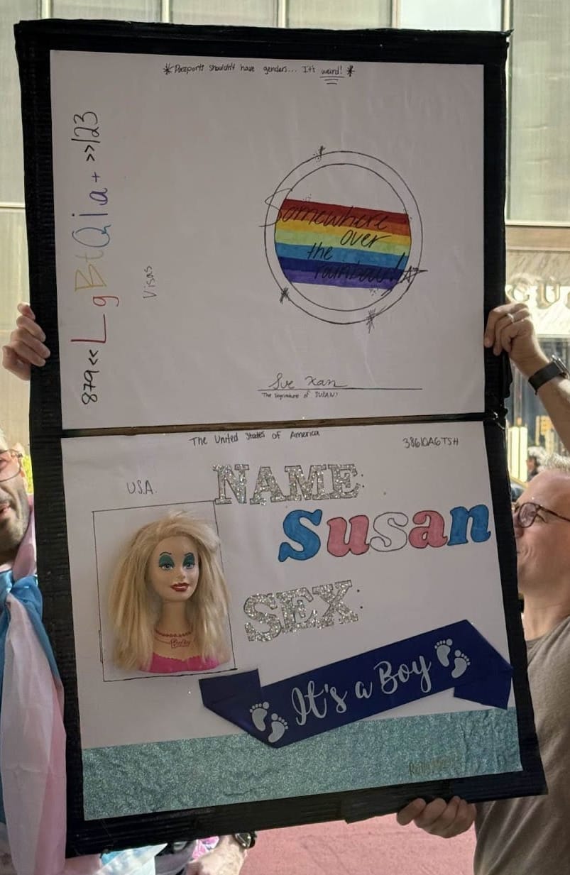 The protest was centered around a large model of a passport of a woman whose sex has been covered over to read “It’s a Boy”. It’s this absurdity that many of us see when our passports come in marked as male, even as our bodies are so obviously feminine.