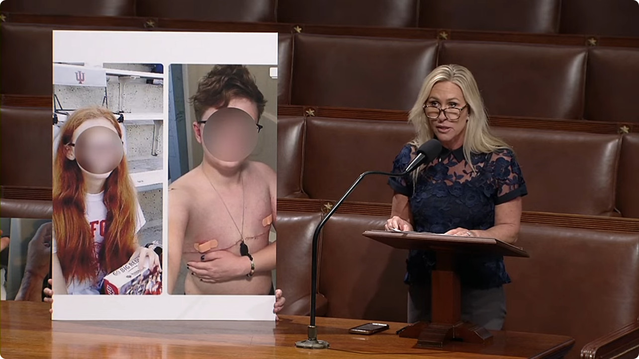 This is also why Rep. Greene used (likely nonconsensual) surgical recovery images of white-skinned teenagers on the house floor to push her bill to make providing any form of transition medicine a Class C felony.