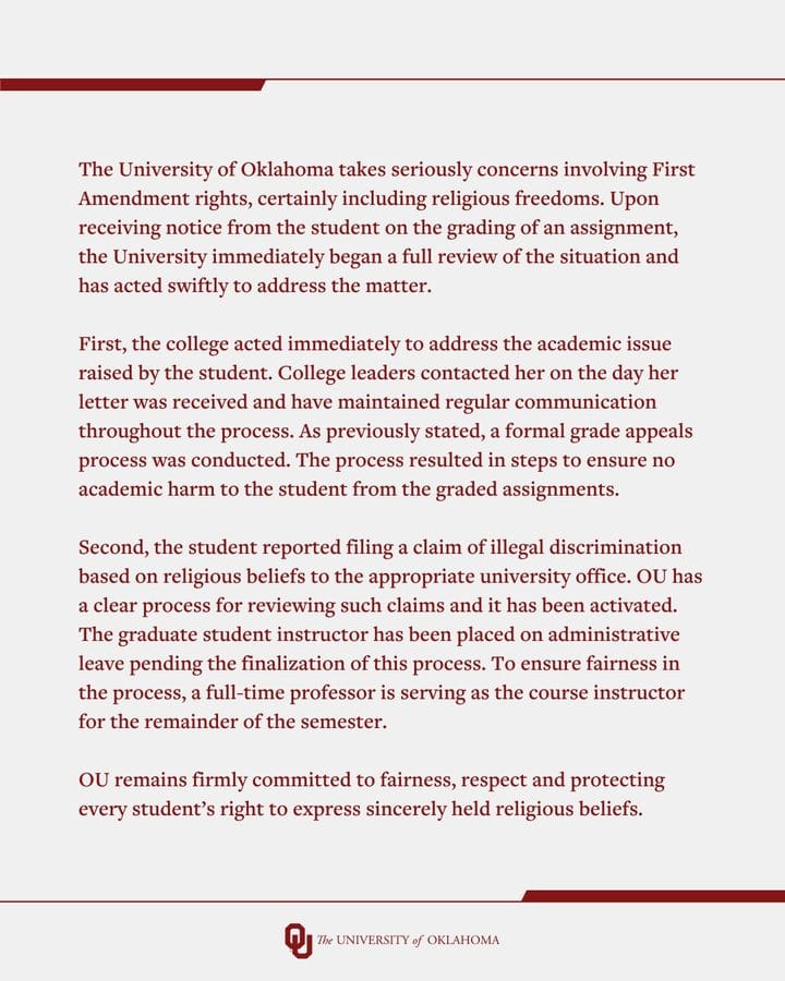 Yesterday, a trans instructor at the University of Oklahoma was put on administrative leave following poorly-evidenced complaints of discrimination by a student with deep ties to christian nationalist politics.